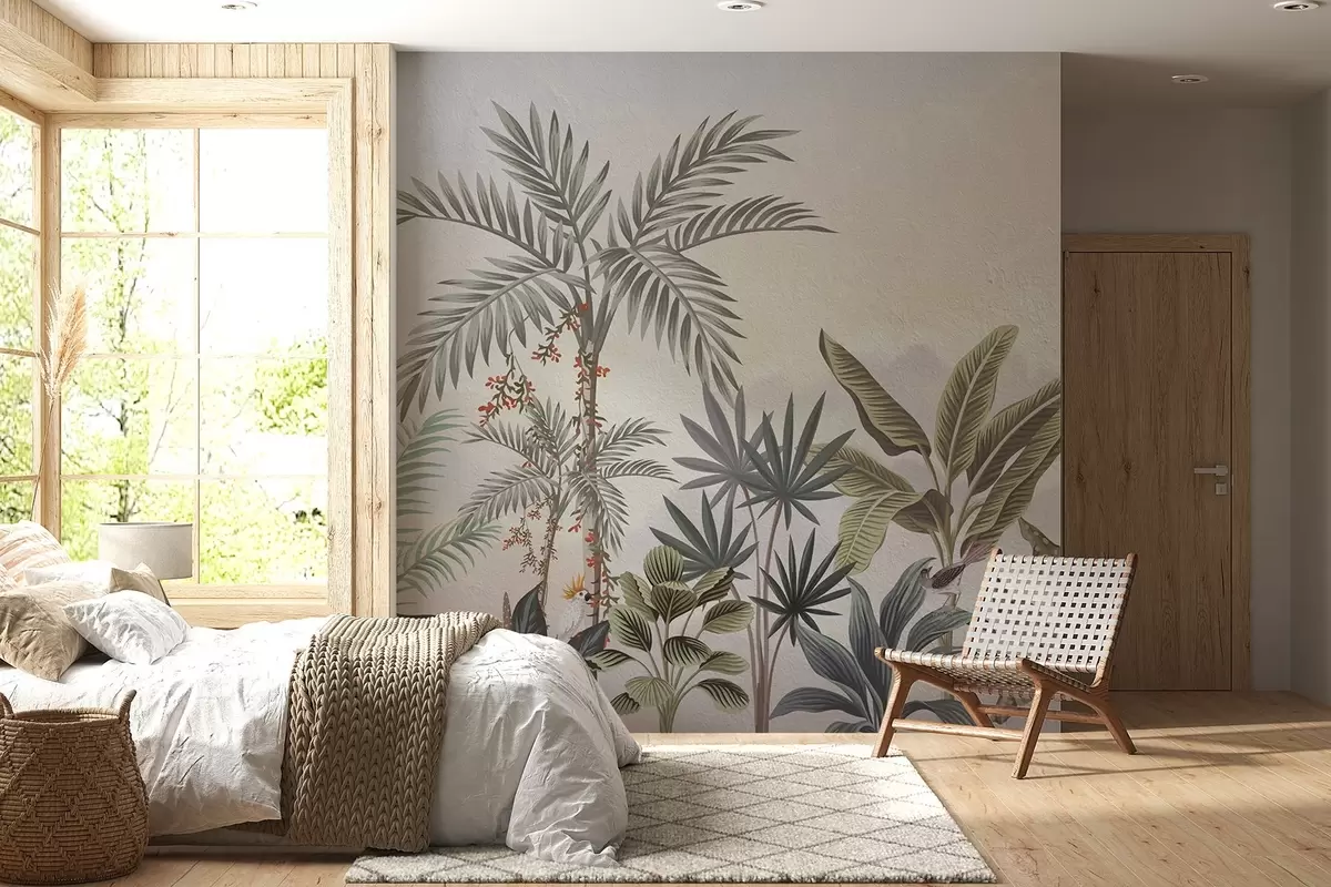 Tropical jungle with palms and colorful birds - Wall mural (No. w08496)