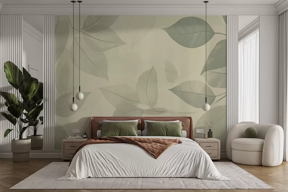 Branches of green leaves on a soft beige background - Wall mural (No. w08502v2)