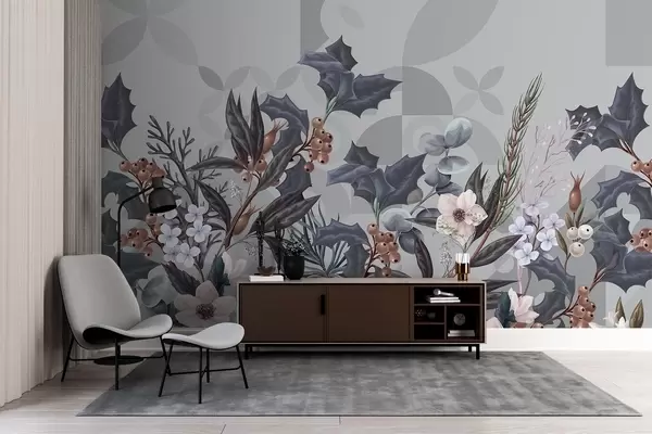 Floral arrangement with large dark leaves, flowers, and berries on a muted gray geometric abstract background - Wall mural (No. w08525)