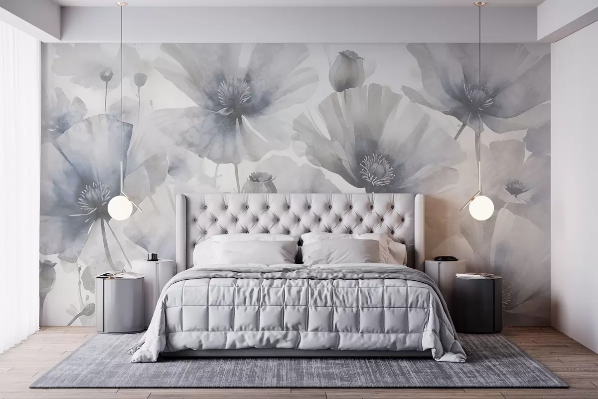 Delicate textural grunge gray and white flowers with soft, blurred petals against a white background - Wall mural (No. w08526)