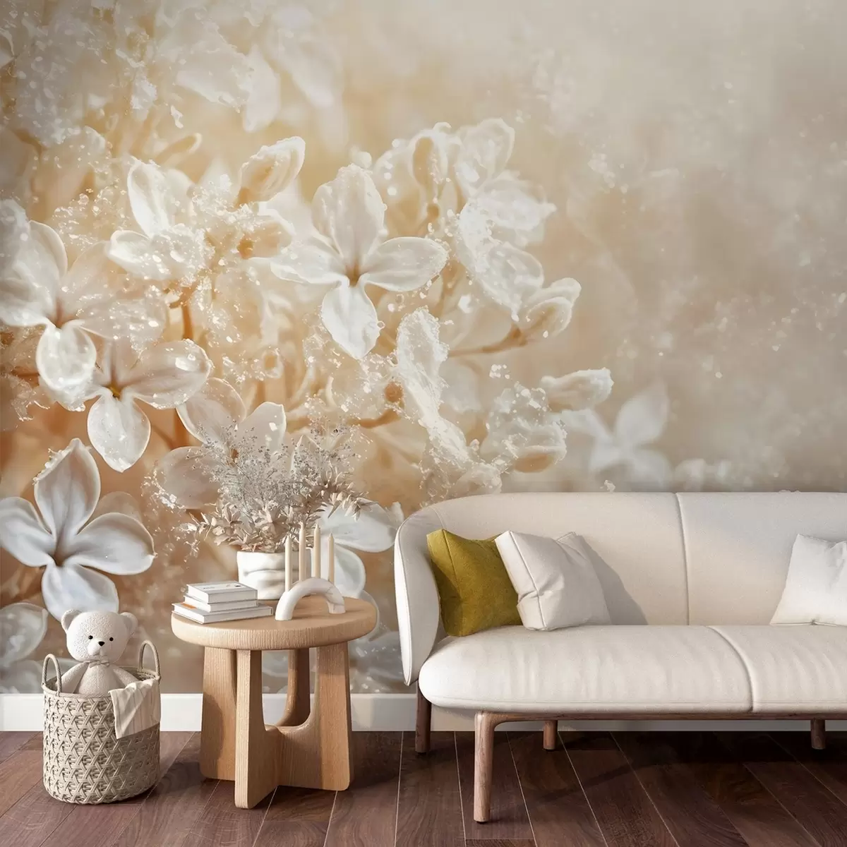 Delicate white lilac flowers with soft, yellow blurred background - Wall mural (No. w08533)