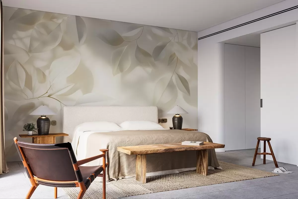 Hanging white branches with leaves against a wall with sunlight - Wall mural (No. w08552)