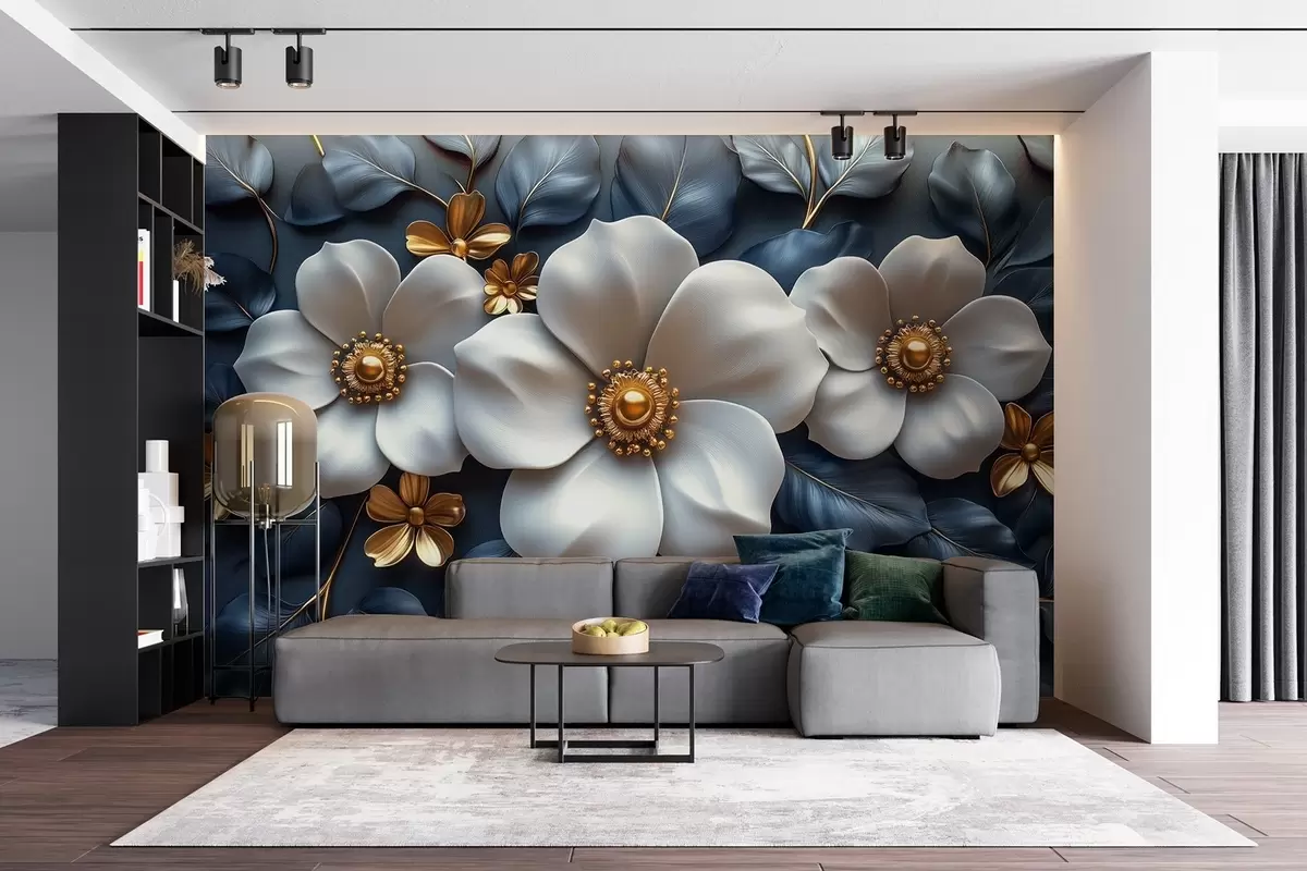 Large white flowers on an elegant blue background with leaves - Wall mural (No. w08559)
