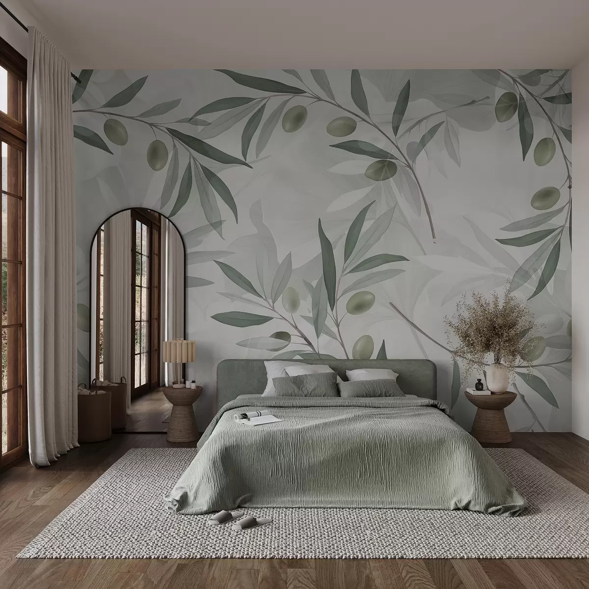 Olive branches with green leaves and olives on a light background - Wall mural (No. w08576)