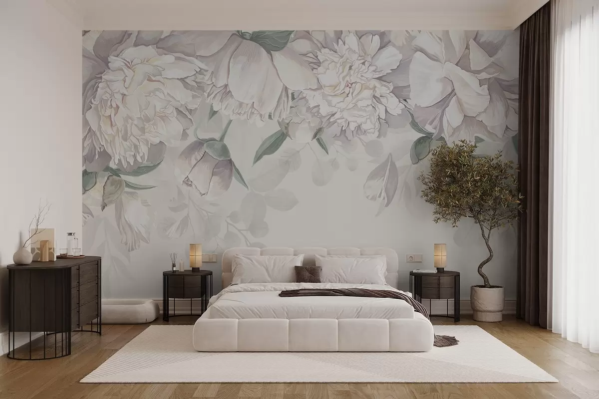 Delicate white and pink pastel peonies with green leaves, arranged in a soft, romantic floral background - Wall mural (No. w08577)