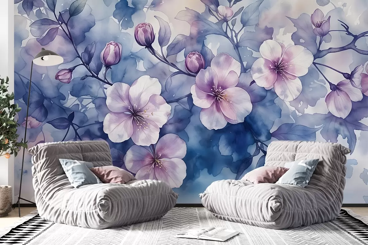 Delicate watercolor imitation pink and purple flowers with soft, blurred petals against a blue splash background - Wall mural (No. w08582)