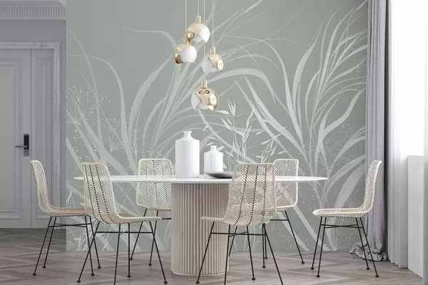 Delicate modern minimalistic white floral print on a light pastel-green background - Wall mural (No. w08583v1)