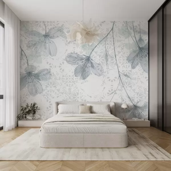 Delicate blue and white flowers with long stems and petals against a soft, blurred textural background - Wall mural (No. w08588)