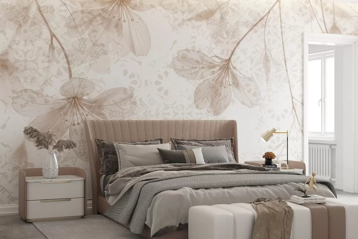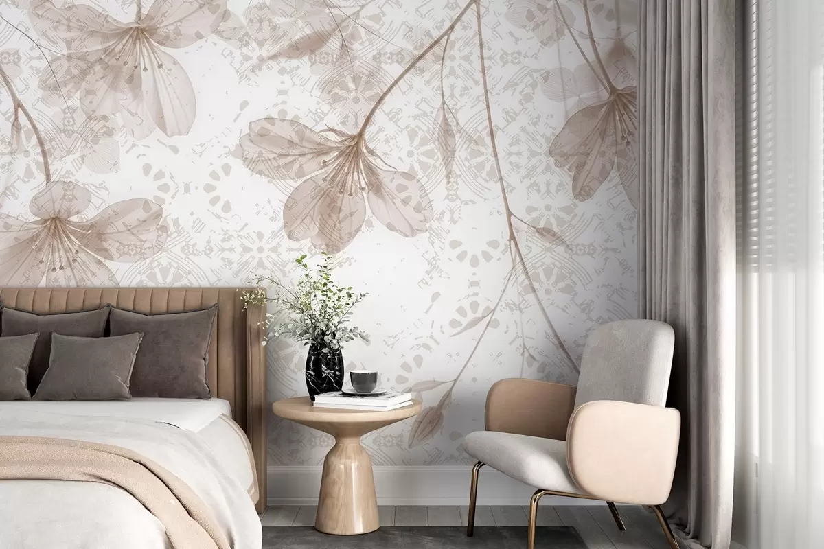 Delicate beige and white flowers with long stems and petals against a soft, blurred textural background - Wall mural (No. w08588v1)