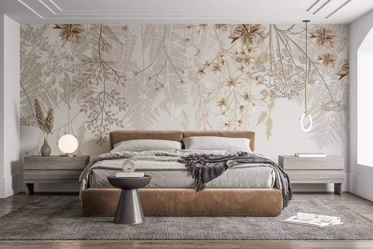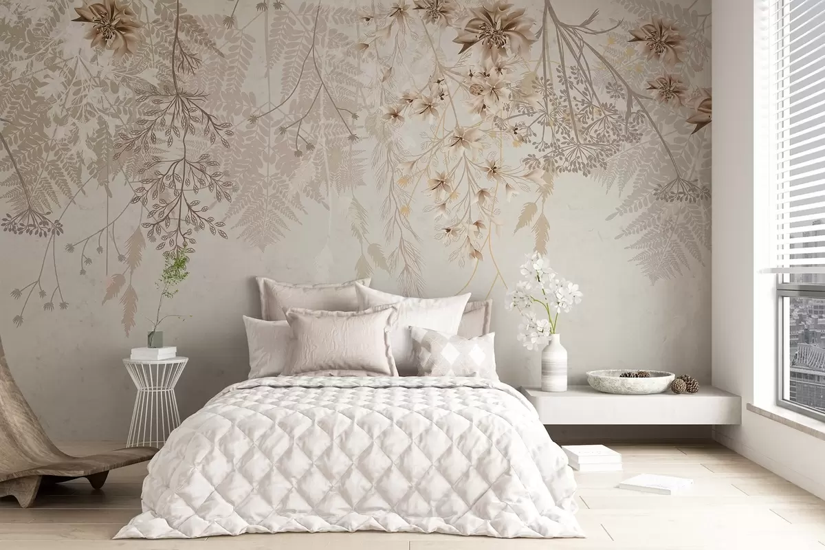 Delicate floral branches and grass with white, gray and beige flowers cascading down a light background - Wall mural (No. w08598)