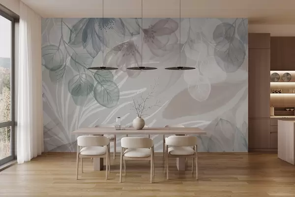 Pastel-colored floral print with transparent large abstract flowers and leaves in shades of gray, pink, and green - Wall mural (No. w08600)
