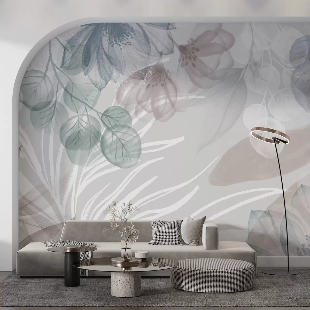 Pastel-colored floral print with transparent large abstract flowers and leaves in shades of gray, pink, and green - Wall mural (No. w08600)