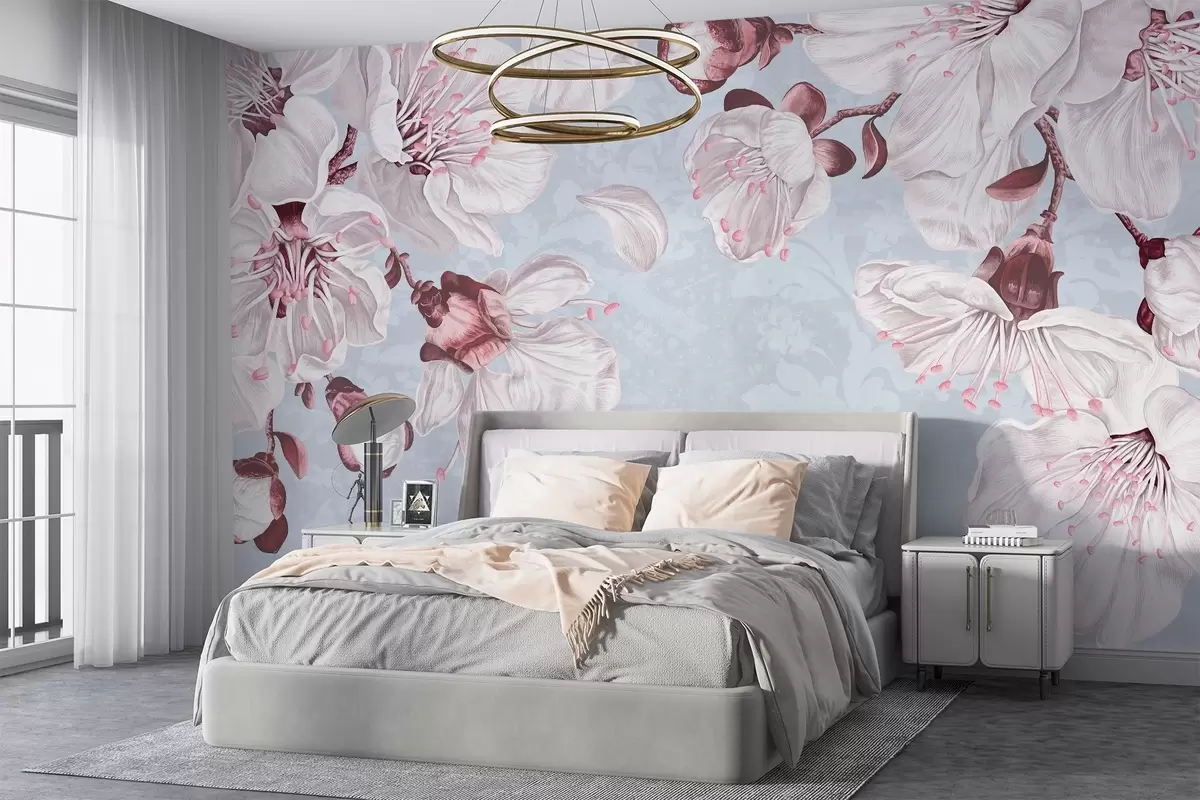 A floral print with large pink and white cherry blooming flowers against a light blue textural background - Wall mural (No. w08601)