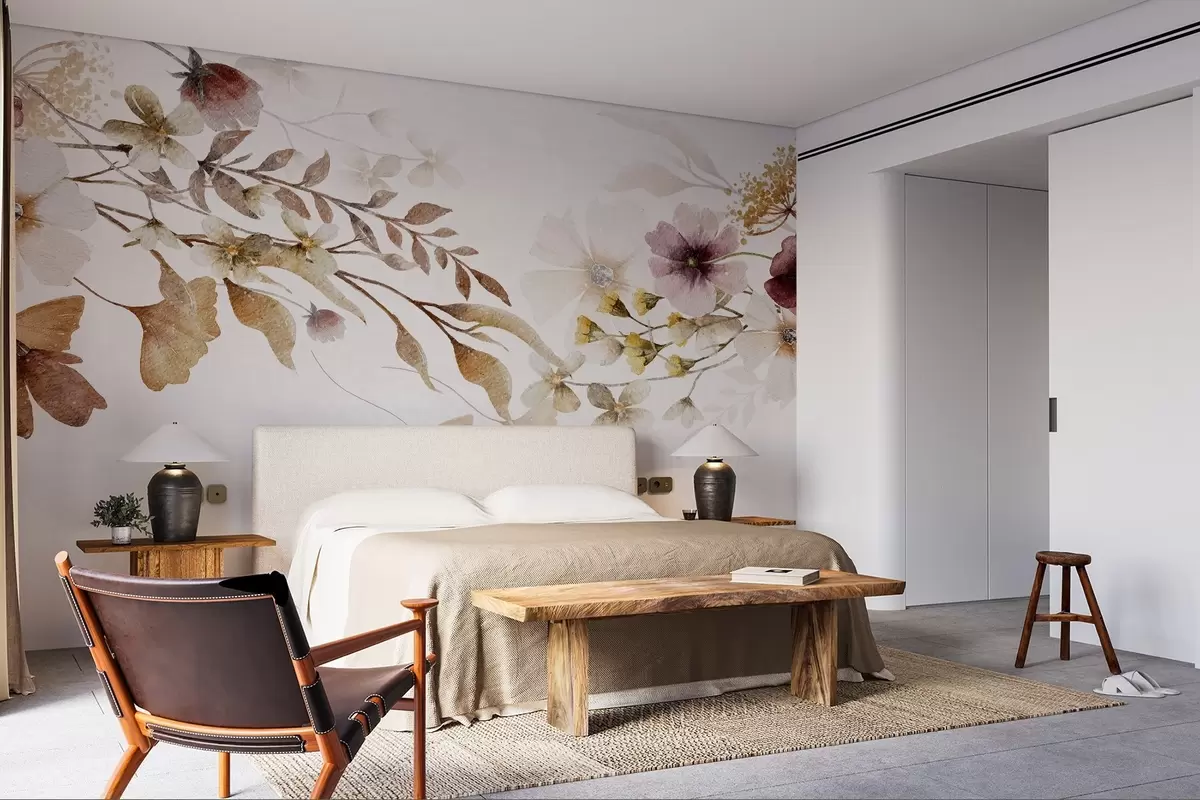 Floral arrangement with soft, muted colors with beige and white flowers and leaves against a light background - Wall mural (No. w08603)