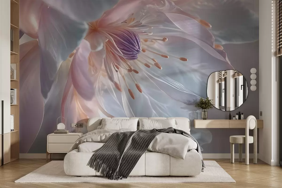 A close-up of a delicate, pastel-colored flower with soft, translucent petals and a vibrant center - Wall mural (No. w08605)