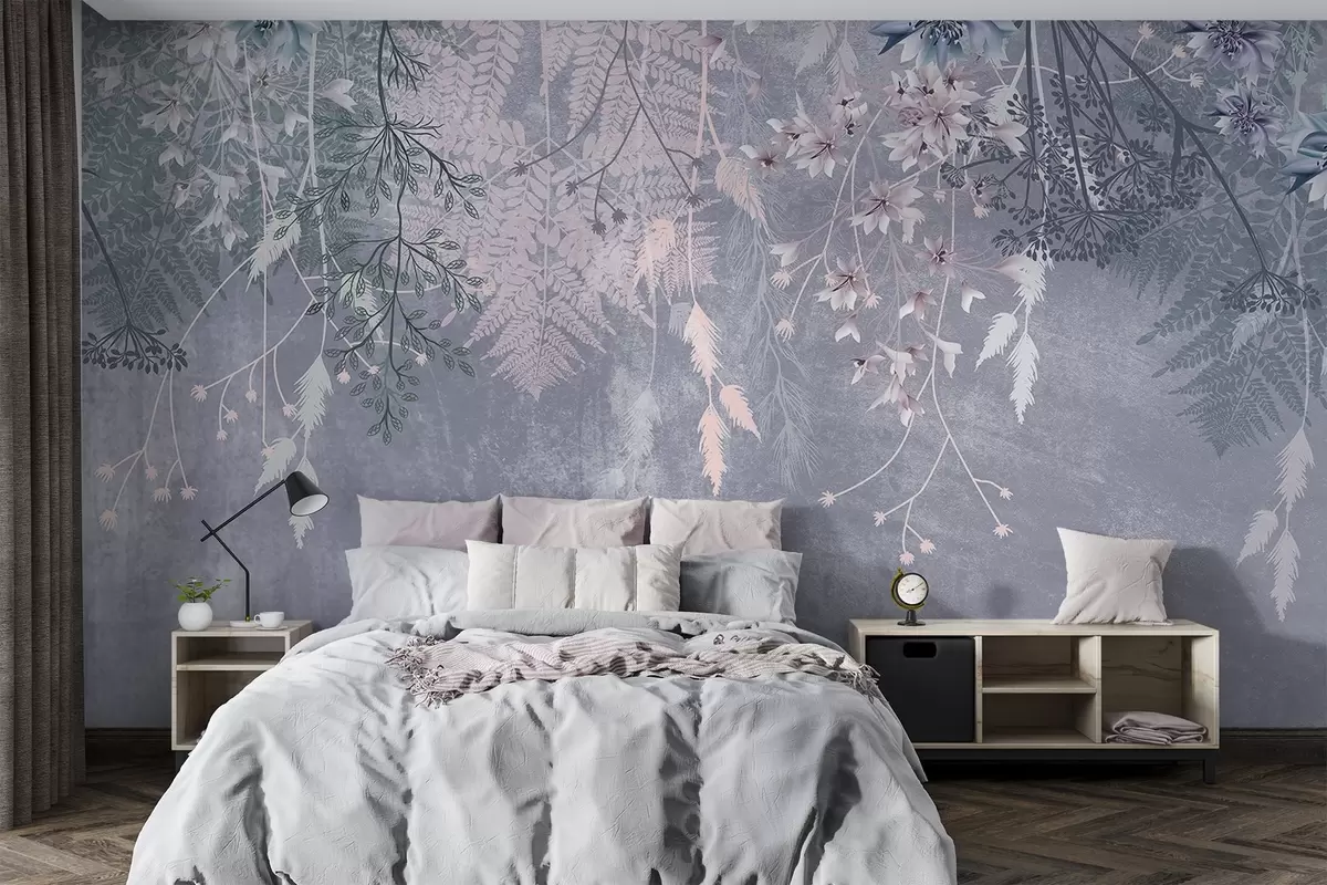 A dreamy, delicate, wispy plants, spikelets and flowers in blue pastel colors against a hazy, textured background - Wall mural (No. w08606)