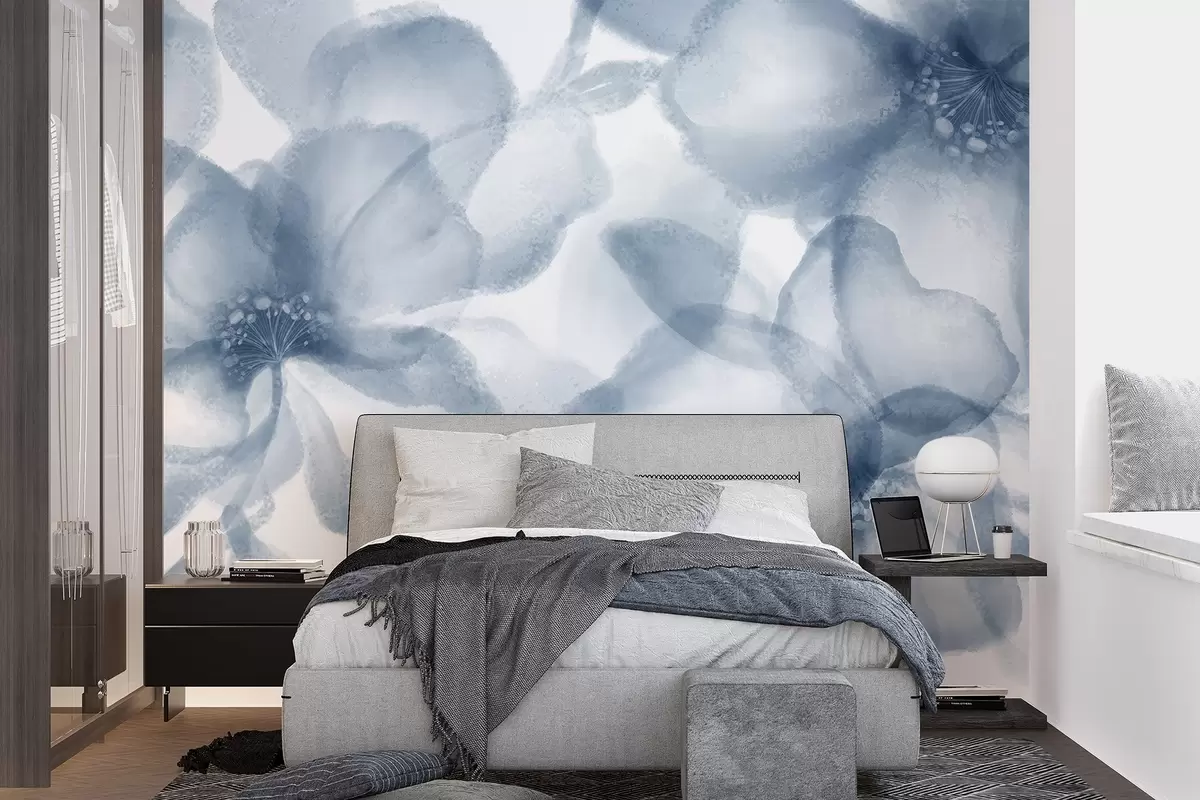 Soft, blurred abstract blue flowers creating a serene and calming floral print - Wall mural (No. w08607)