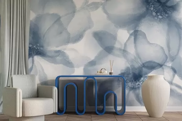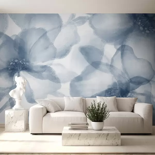 Soft, blurred abstract blue flowers creating a serene and calming floral print - Wall mural (No. w08607)