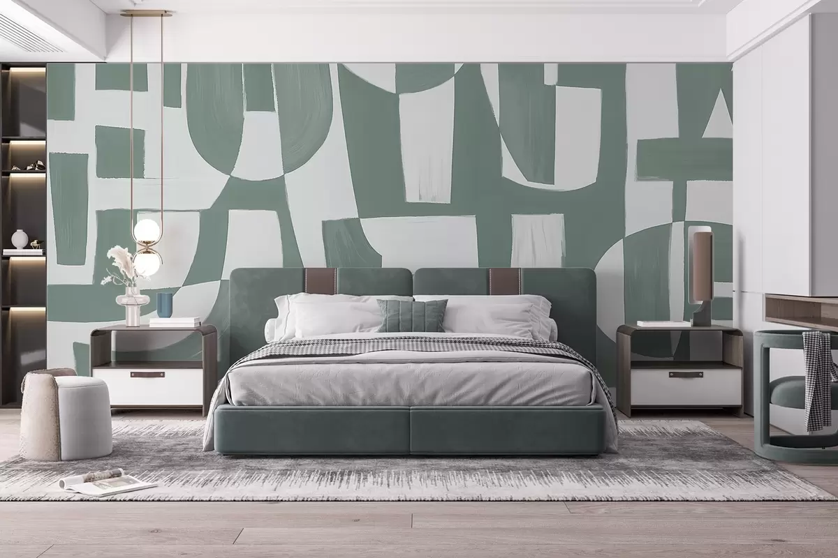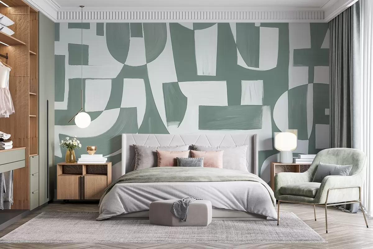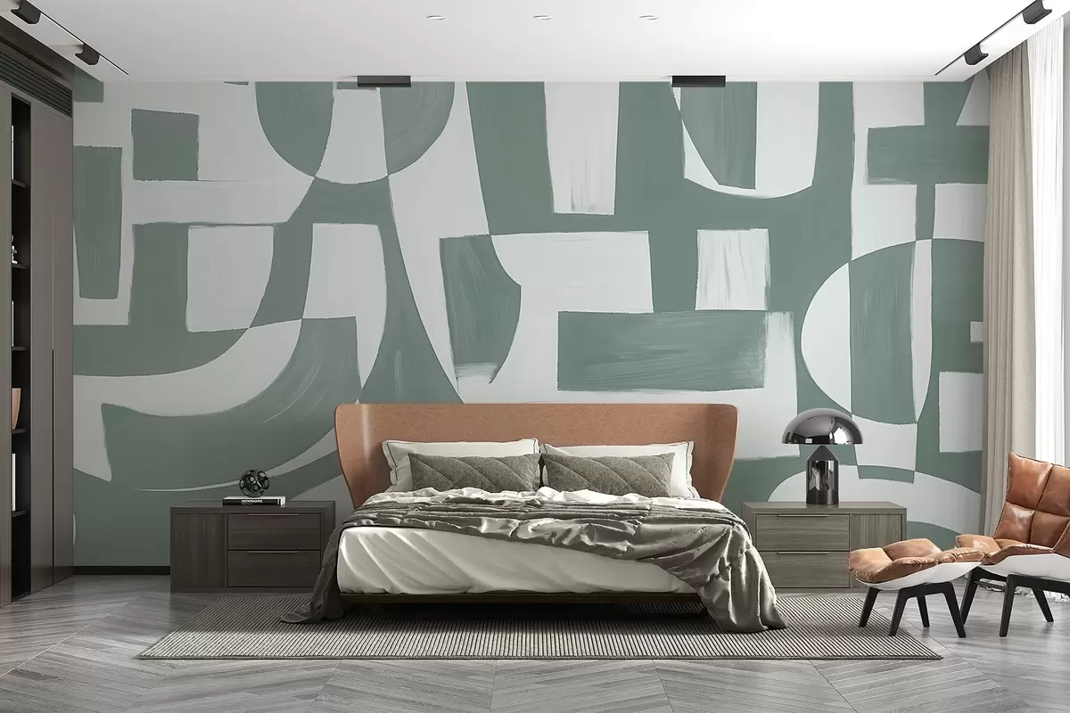 Abstract green and white geometric shapes and patterns, creating a visually striking and dynamic composition - Wall mural (No. w08608v1)