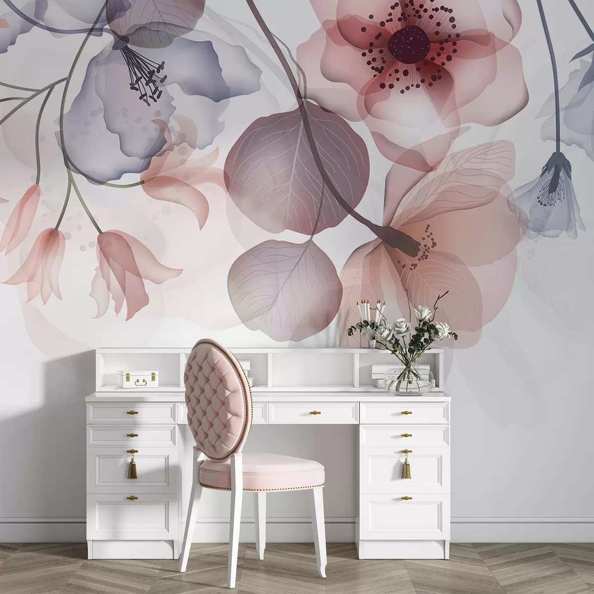 Delicate pink and gray translucent flowers with soft petals and dark centers, against a light background - Wall mural (No. w08613)