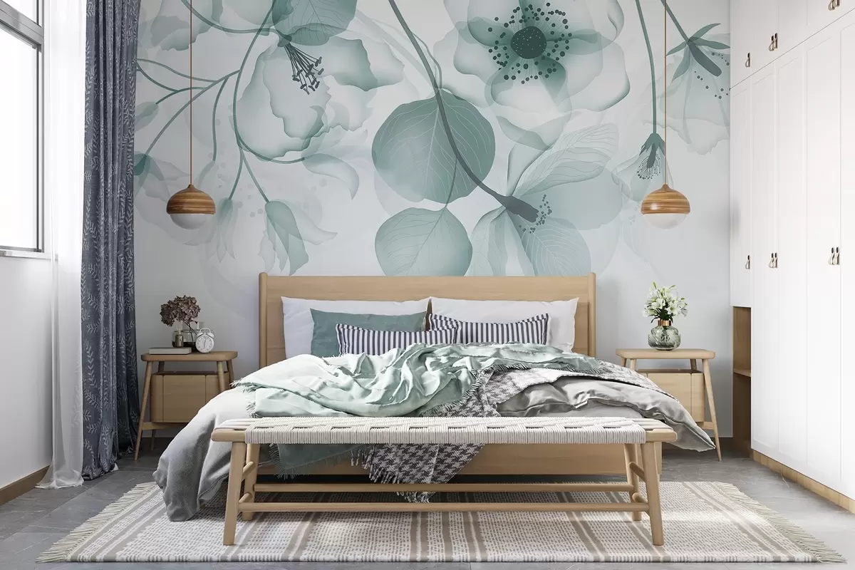 Delicate muted turquoise translucent flowers with soft petals and dark centers, against a light background - Wall mural (No. w08613v1)