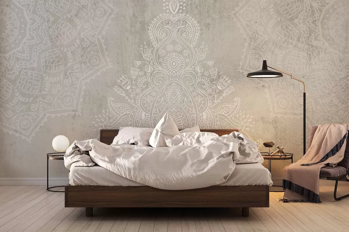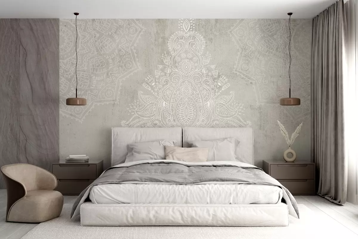A detailed, intricate white lace mandala print on a light beige textured abstract background - Wall mural (No. w08614)