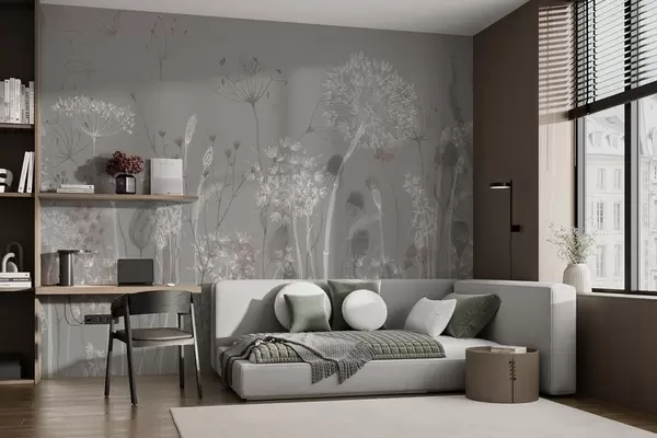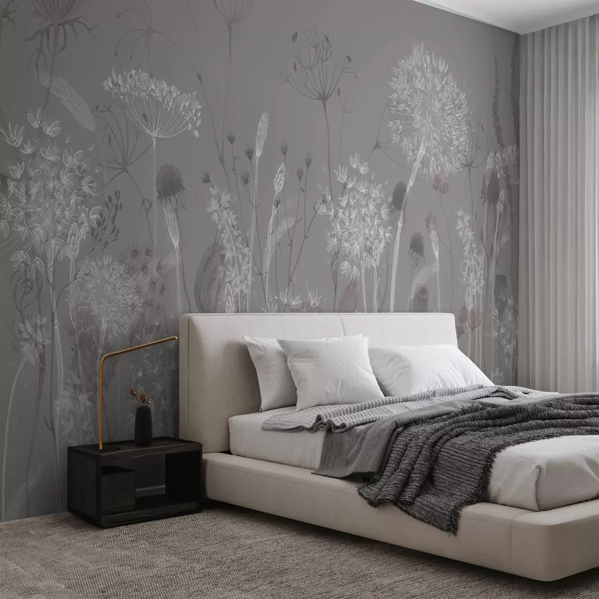 Airy dandelions and wildflowers in watercolor style in blue-gray tones - Wall mural (No. w08637v3)