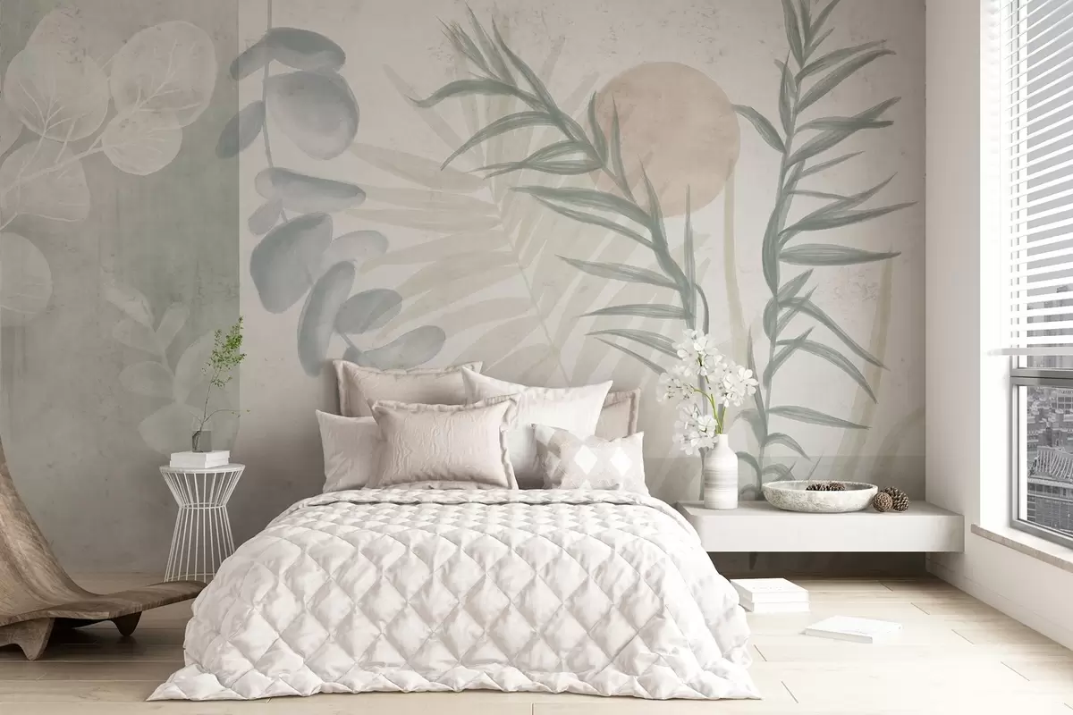 A minimalist abstract print with stylized leaves and eucaliptus with soft, blue organic shapes in muted pastel colors - Wall mural (No. w08648v1)