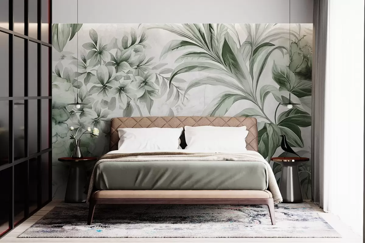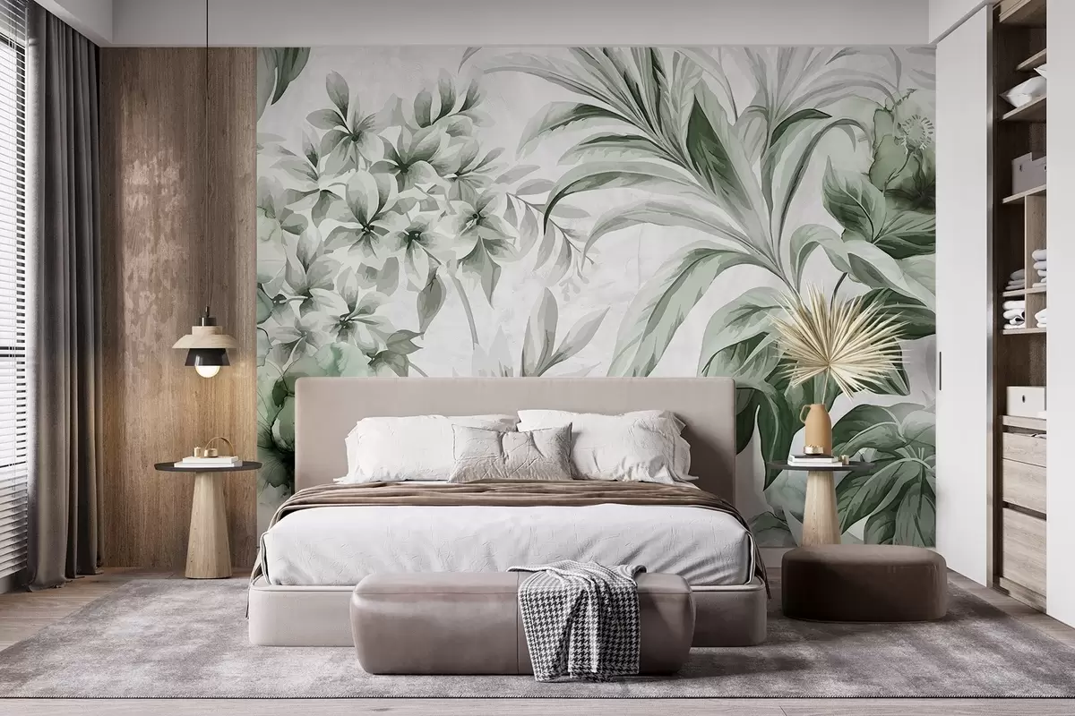 Tropical leaves and foliage in a muted palette ranging from light to dark shades of green on textured light background - Wall mural (No. w08650)