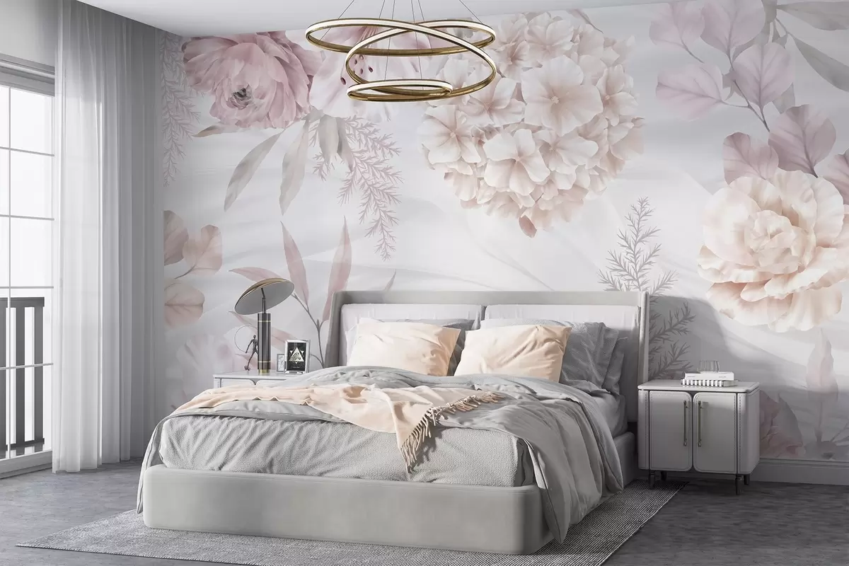 A soft, abstract floral print with large pink and white flowers, delicate leaves, and a muted, pastel color palette - Wall mural (No. w08651)