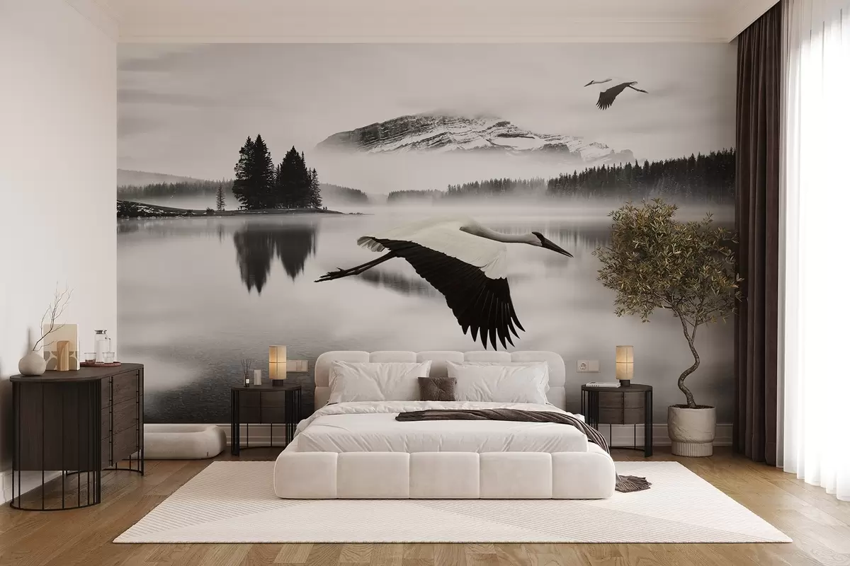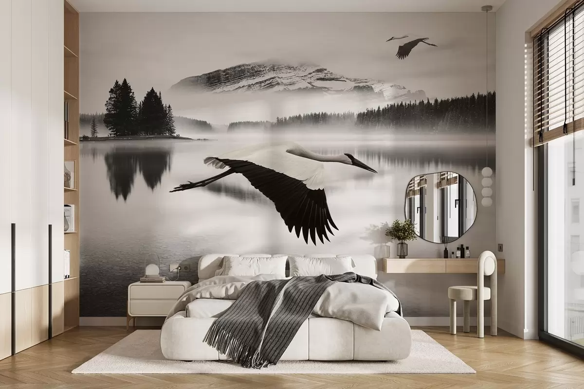 A stork in flight over a river and mountains, black-and-white landscape with birds - Wall mural (No. w08658)