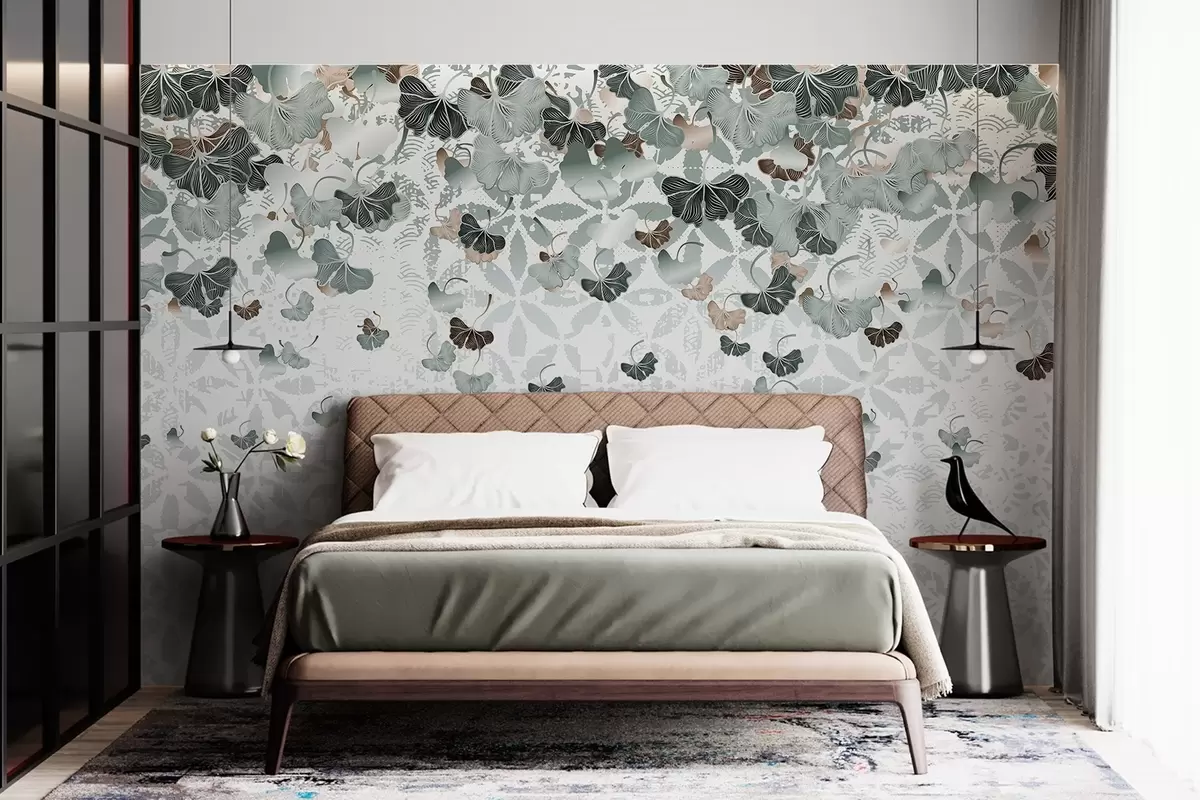 Cascading ginkgo leaves in shades of green and brown, against a textured background with floral motifs - Wall mural (No. w08662)