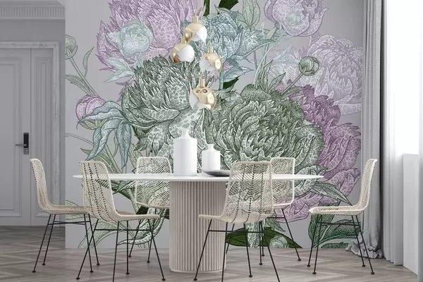 A detailed floral line design featuring large peonies and leaves in shades of green, pink and lilac - Wall mural (No. w08663v1)