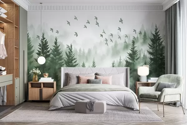 Tranquil foggy forest with trees in shades of green and flock of birds is flying in the sky - Wall mural (No. w08664v1)