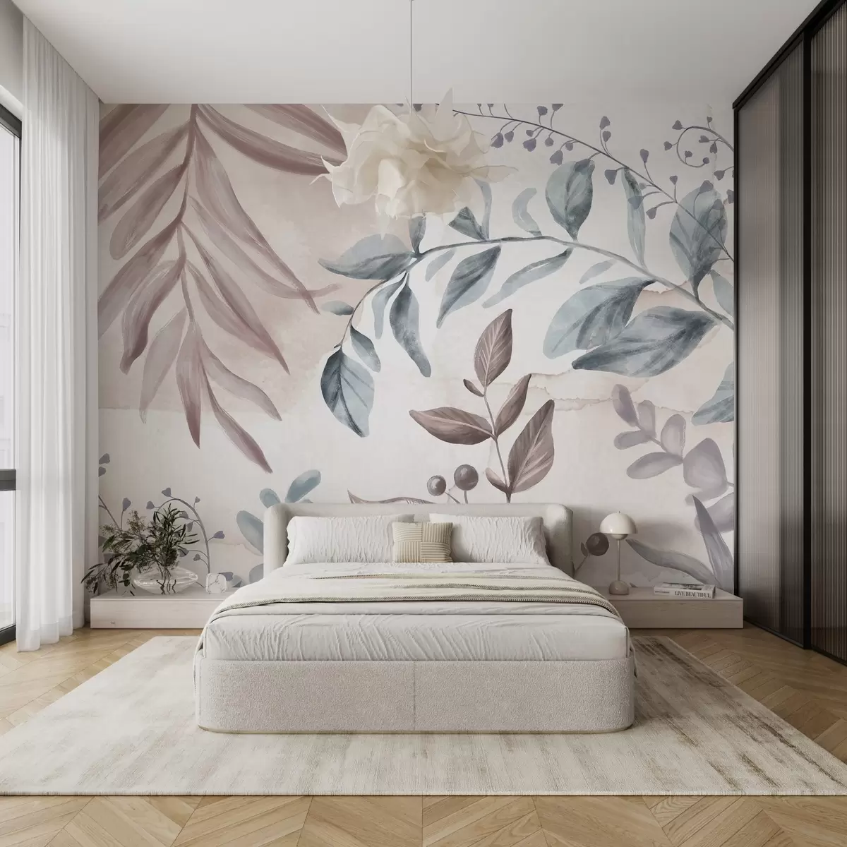 Botanical print with leaves and floral branches in soft pastel colors, on watercolor-like background - Wall mural (No. w08668)