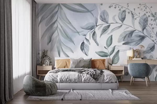 Botanical print with leaves and floral branches in soft pastel colors, on watercolor-like background - Wall mural (No. w08668v1)