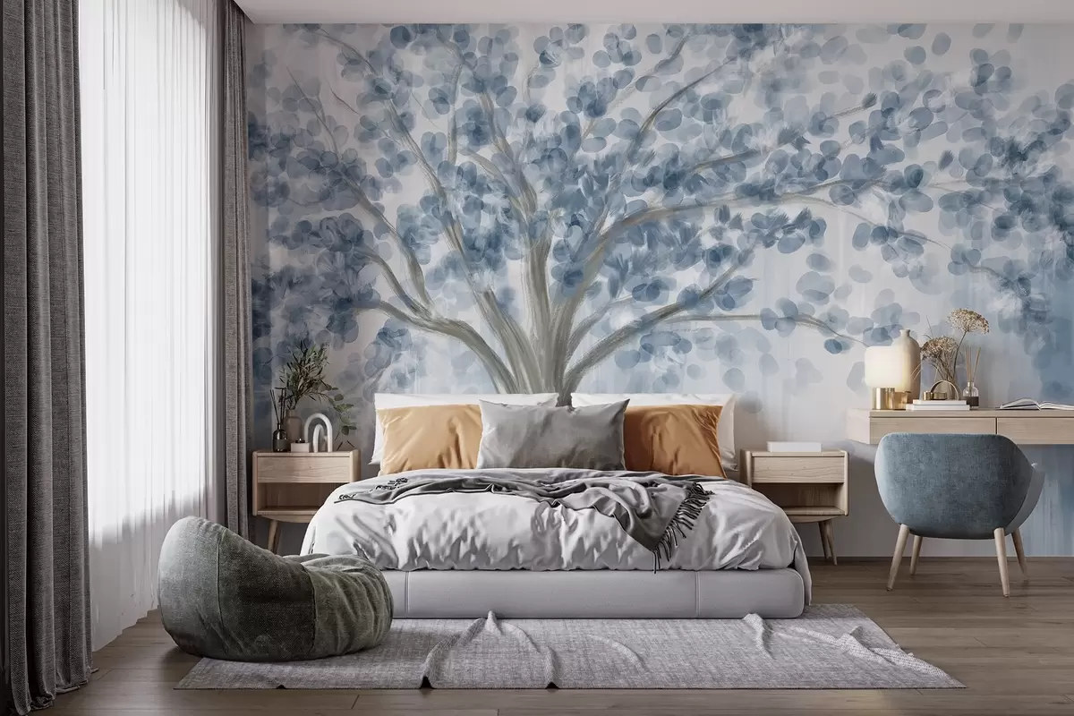 A large tree with soft, abstract leaves in blue on a light, neutral background enhancing the tree's tones - Wall mural (No. w08669v1)