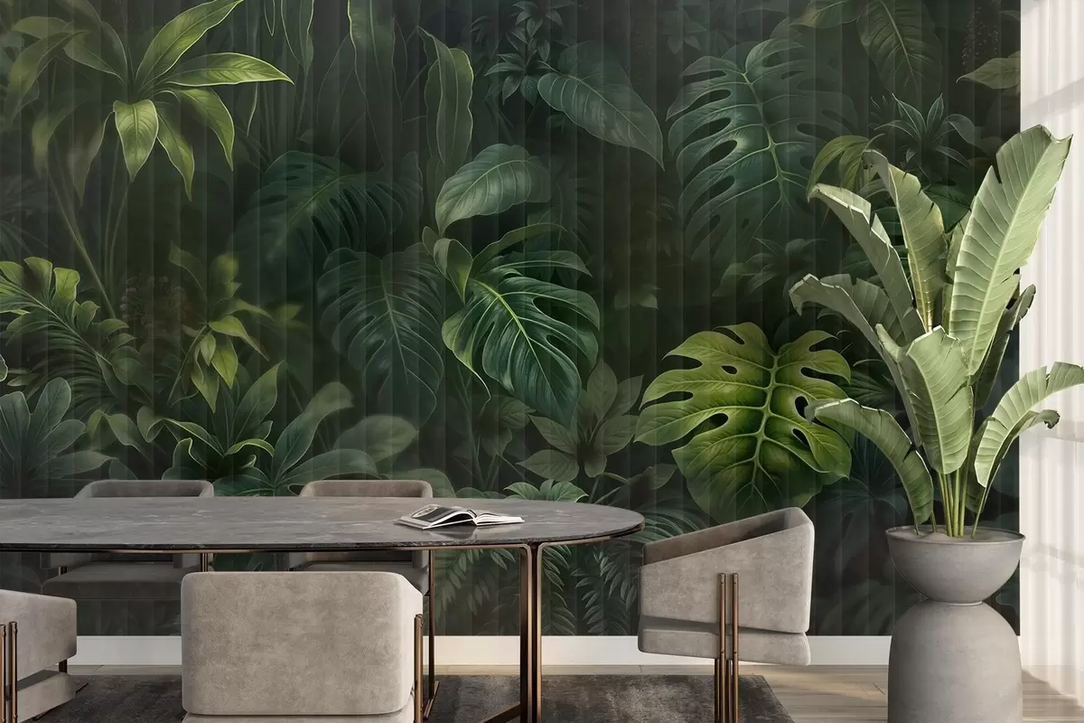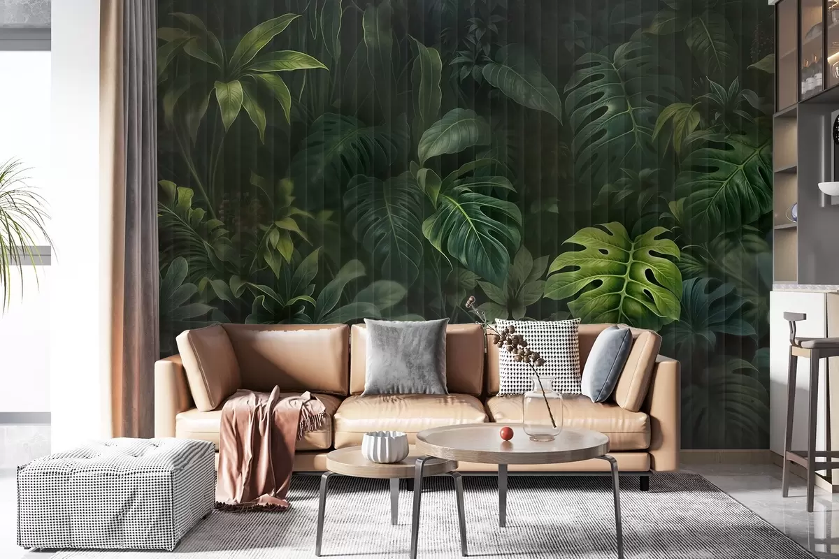 Tropical dark blurred and textured print with various green leaves, including monstera and palm leaves - Wall mural (No. w08673)