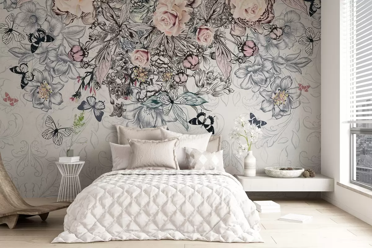 A floral drawing with pink roses and various flowers and butterflies with intricate line art on textured background - Wall mural (No. w08674)