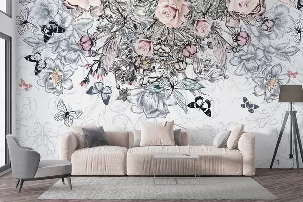A floral drawing with pink roses and various flowers and butterflies with intricate line art on textured background - Wall mural (No. w08674)