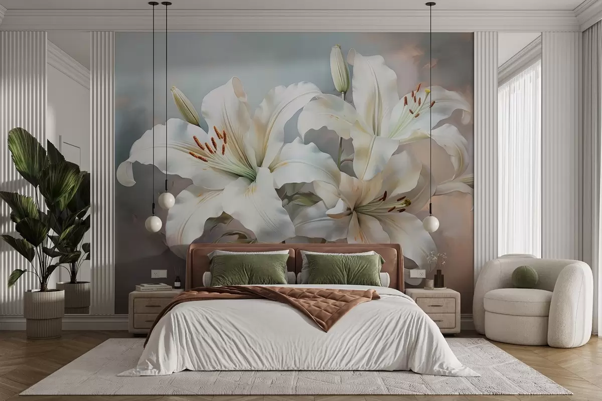 Elegant white lilies in pastel tones with a texture imitating brushstrokes - Wall mural (No. w08678)