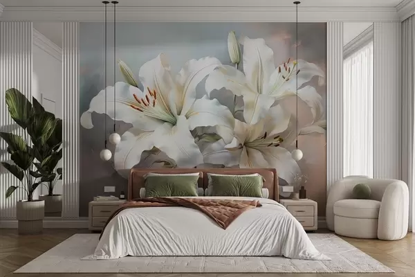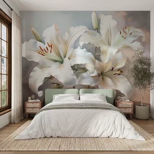 wall murals Elegant white lilies in pastel tones with a texture imitating brushstrokes w08678