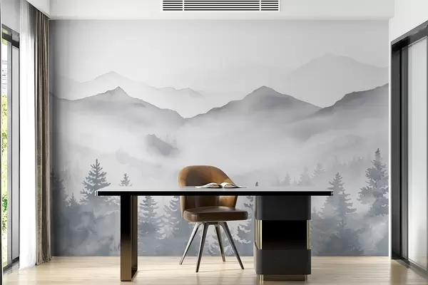 Serene mountain landscape with misty forests in soft gray and blue tones - Wall mural (No. w08680)
