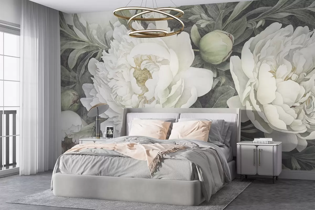 Textured pastel white peonies with soft green buds and leaves with delicate petals - Wall mural (No. w08697)