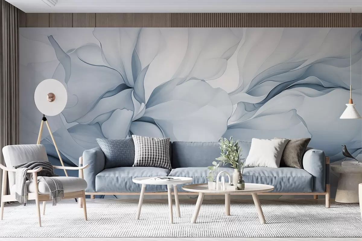 Flowing abstract floral petals translucent and layered shapes in pastel colors, in blue shades - Wall mural (No. w08701v2)