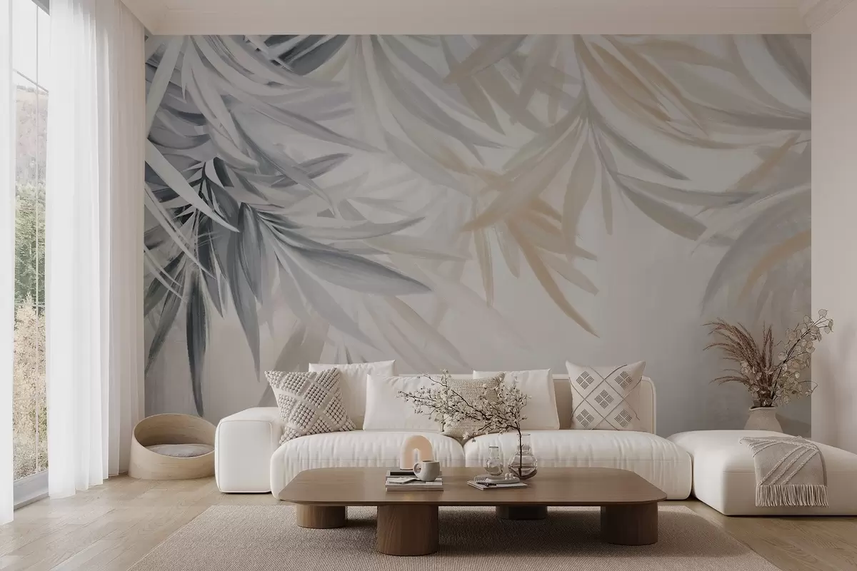 Soft, flowing light-colored tropical leaves in shades of gray and peach, blending into a pale, neutral print - Wall mural (No. w08703)