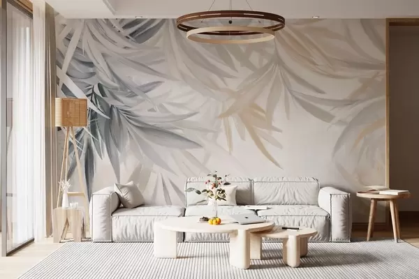 Soft, flowing light-colored tropical leaves in shades of gray and peach, blending into a pale, neutral print - Wall mural (No. w08703)