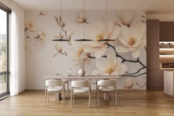 Beautiful blooming cream-colored magnolia flowers on a white background - Wall mural (No. w08721)