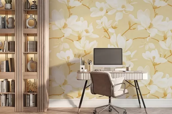 Pattern of white magnolia flowers, in yellow shades, white leaves and branches - Wall mural (No. w08726v3)