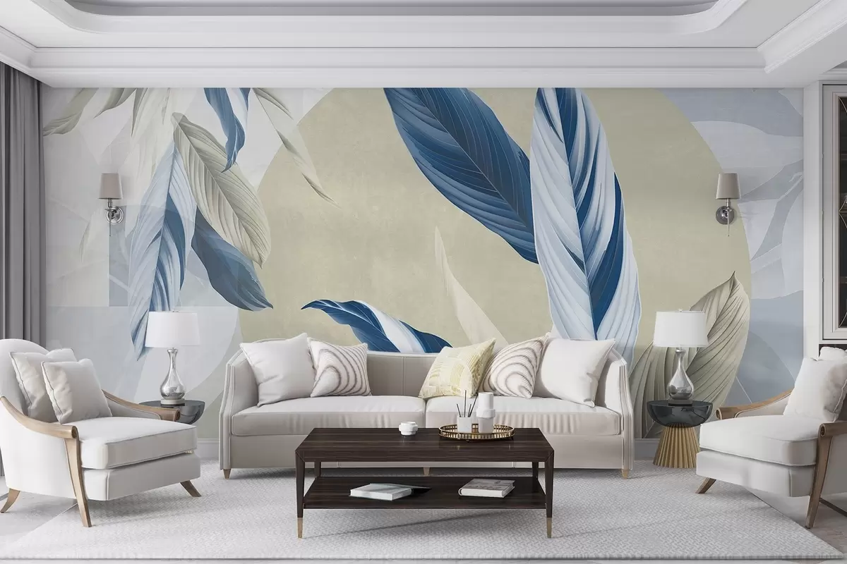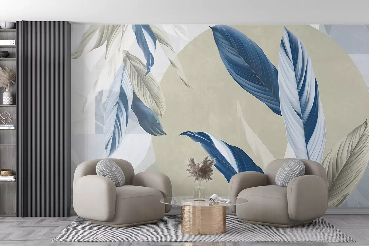 Modern and abstract geometric textural composition with detailed leaves in shades of blue, beige and white - Wall mural (No. w08741)